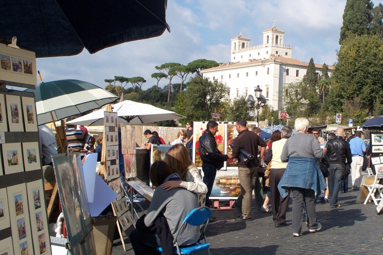 “Thirty euros, Senora.” Kathy heard, caught my eye, and frowned. Thirty euros was a lot. I smiled at the artist and picked up a smaller print of the Spanish Stairs instead. “Ten euros.” I shook my head but set it next to the larger print. Next came a small print of the Pantheon. The artist said nothing, only waited. Finally, I picked up a small print of the Colosseum, added it to the others and looked at him. ‘Sixty euros, Senora.’ I sighed and began to walk away. “Forty euros?” I turned back and rummaged in my purse for the envelope with my personal funds. I thrust forty euros into his hands, and he bagged my purchases and passed them over. We smiled at each other in perfect understanding. Speaking Italian was easier than I’d thought.