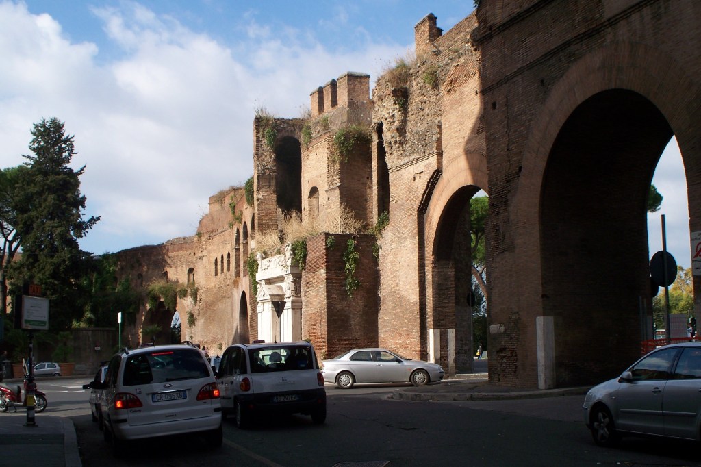 Our ride ended atop a massive hill that abutted the sprawling garden estate of the Borghese Museum. There the Marriott Grand Flora held court like some Grande Dame of the past century, dominating the crest of the Via Veneto, one of the most famous streets in Rome. I stared up at the neoclassic pink and white edifice and then looked across the road at the looming, red brick wall, perhaps 40 feet in height and all of 10 feet thick. Huge arches opened along its massive length, allowing modern sports cars to pass below.