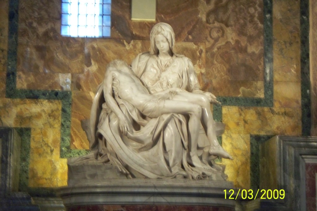 I hadn’t known that Michelangelo’s famous Pieta held court in the first chapel inside the cathedral’s entrance, so finding her there was a bit of a shock. So was the bulletproof, acrylic panel, placed there following the statue’s restoration after an attack by a mentally disturbed man in 1972. I also discovered that the huge paintings inside the nave and side chapels were actually mosaics, done in squares of glass so tiny they created the illusion of oil paintings. The Church had, our docent explained, learned from the centuries of soot that had built up in the Sistine Chapel before its latest restoration, an effort that took 20 years (1979 – 1999). The mosaics could be cleaned and looked as vivid and new as when they’d first been commissioned.